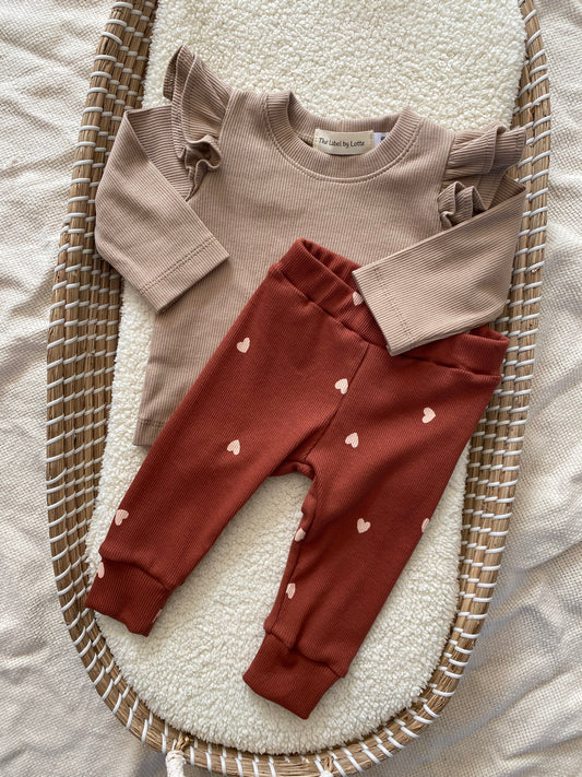 Meisjes kinderlegging hartjesprint brique zand ribstof