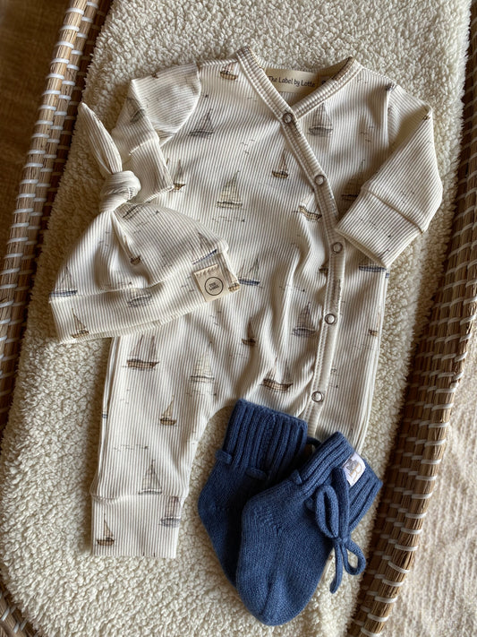 Newborn jongens knoopmutsje zeilbootjes offwhite