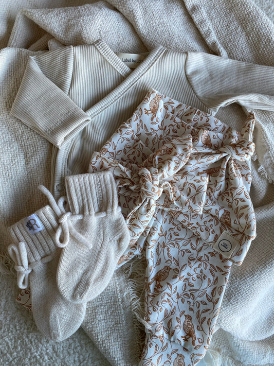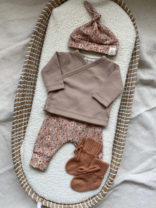 Newborn meisjes knoopmutsje bloementjesprint zand/bruin