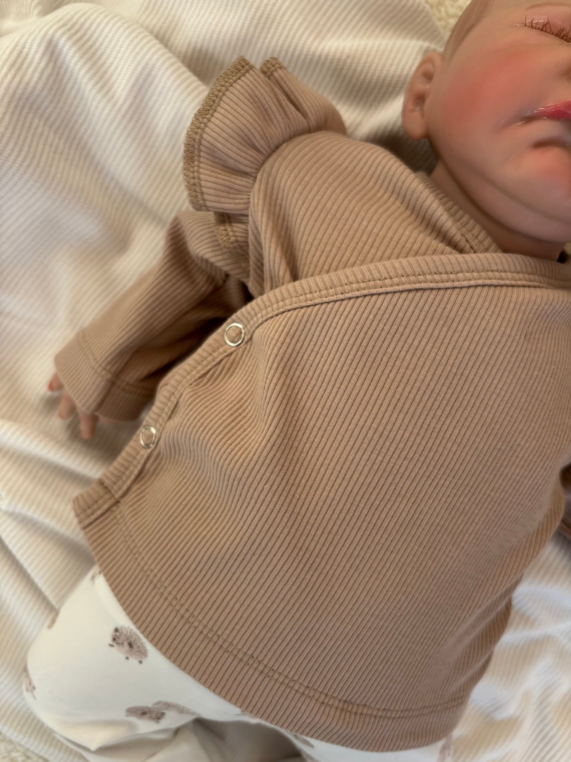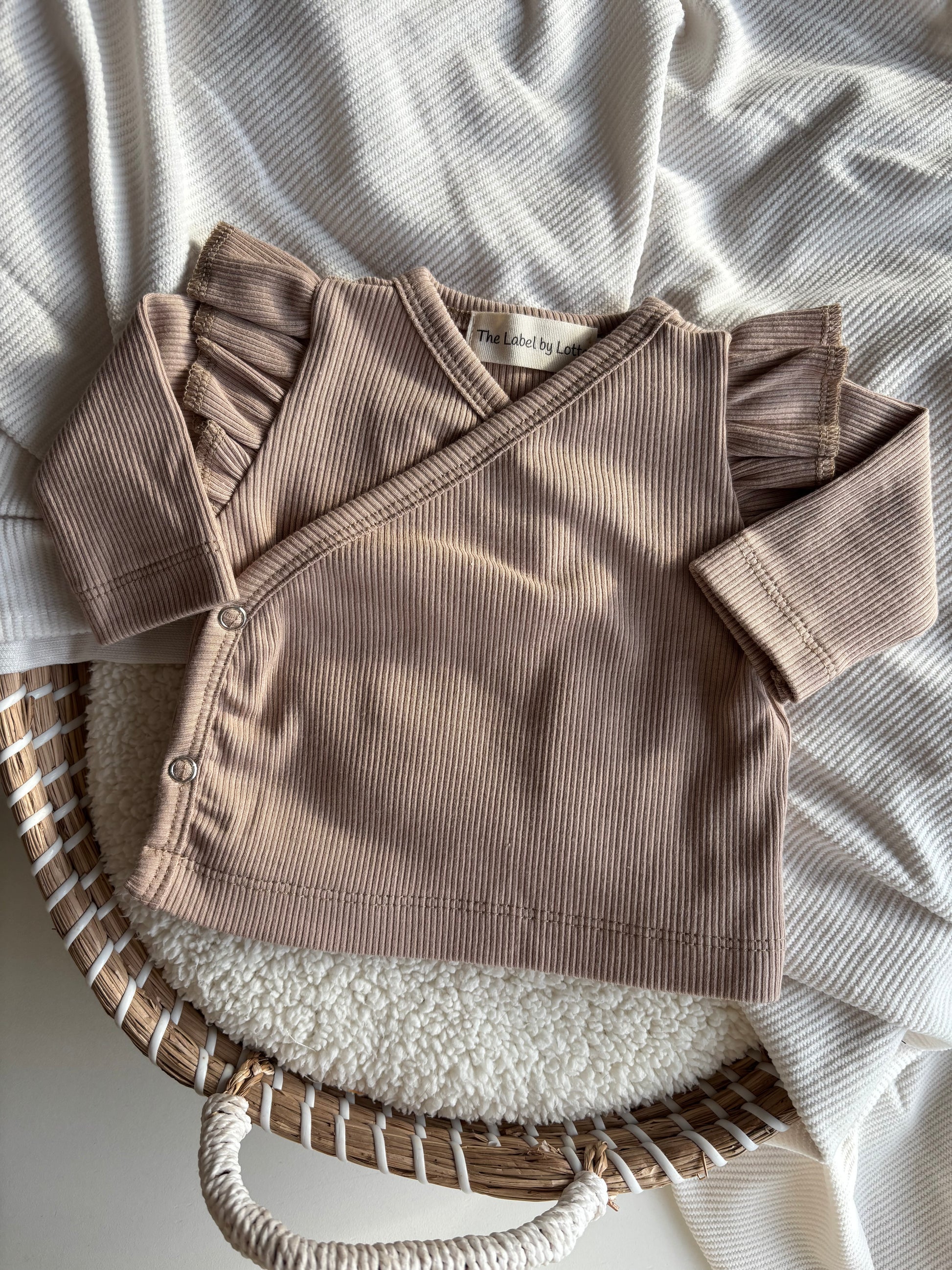 Op zoek naar een lief, comfortabel en praktisch shirtje voor jouw mini? Dit zandkleurige overslagshirtje met ruffle is precies wat je nodig hebt. Handgemaakt van een zachte, rekbare ribstof die heerlijk meebeweegt met je baby. De warme zandtint past bij vrijwel elke outfit en is daardoor ideaal om eindeloos te combineren.