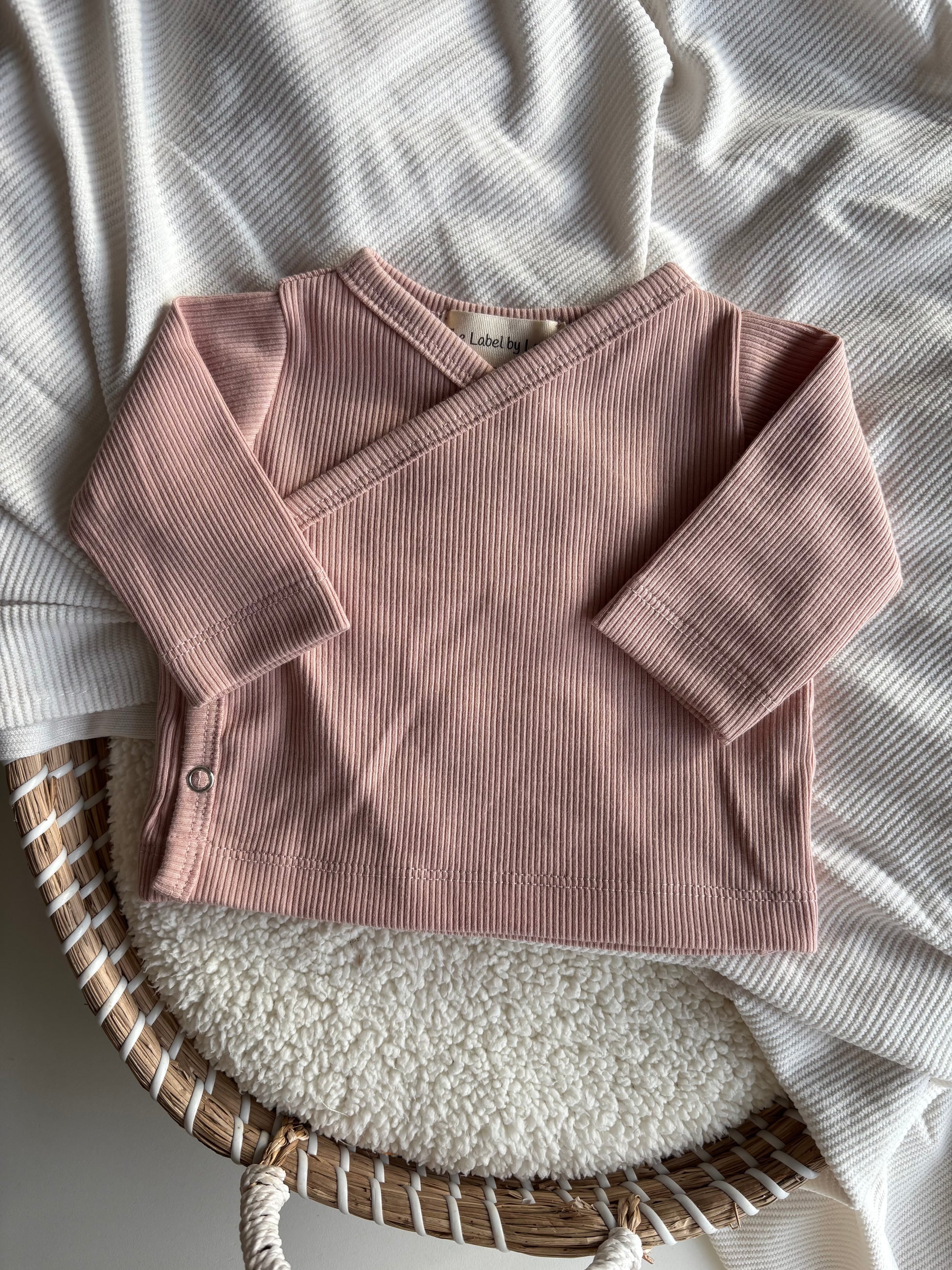 Dit mooie overslagshirtje is gemaakt van een prachtige rozekleurige ribstof. Door de zachte kleur is dit overslagshirtje heel makkelijk te combineren met verschillende broekjes uit de collectie.